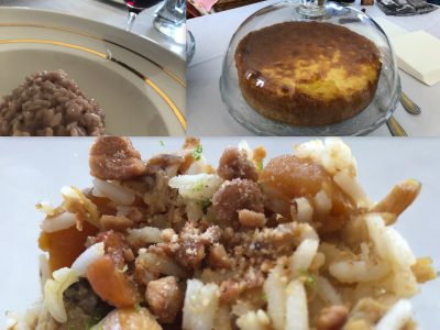 Per antipasto il riso varietà Apollo, dai sentori aromatici di frutta secca e fiori bianchi, si si sposa con un’insalatina di pollo al sapor mediorientale. Con il primo entra in scena il re dei risi Testa, il Baldo Riserva. Proprio come un vino, il Baldo Riserva riposa 3 anni nei silos durante i quali i suoi chicchi si arricchiscono di sostanze nutritive, vitamine e minerali fino ad aumentare di volume. Con il Baldo Riserva, Monica ha creato un risotto che unisce altre due eccellenze piemontesi: la Toma della Valsesia (formaggio di latte vaccino a pasta cotta) e il Boca, vino Doc prodotto nell’omonima cittadina in provincia di Novara. Baldo in versione tradizionale, che vanta una buona tenuta alla cottura ed è quindi indicato per la cottura al forno, è invece stato impiegato dalla chef per la torta di riso dolce.