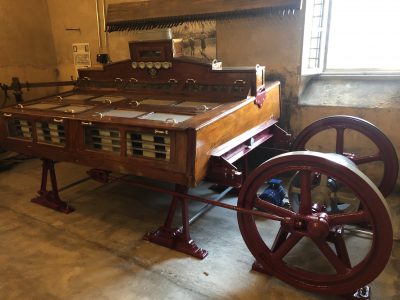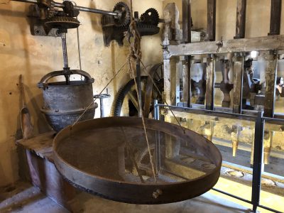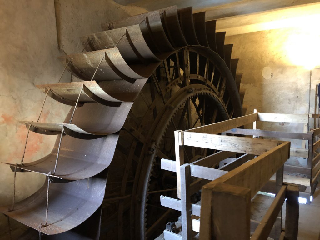 La roggia ha un salto d’acqua sfruttato, fin dal ‘600, per far girare un’imponente ruota idraulica. Questa muove la vecchia macina in pietra (molazza) e la storica “pista da riso”. Ed è proprio in questi macchinari antichi, fatti di legno, pietra e ferro, che risiede la particolarità che rende unica la Grampa. Infatti, dopo un complesso lavoro filologico di recupero e ricostruzione di alcune parti meccaniche, unico in Italia, il mulino è tornato in vita. Tutto scorre, come secoli addietro, quando un sofisticato sistema di paratie a timone di legno e di vite senza fine in ghisa regolavano il ciclo produttivo del riso.