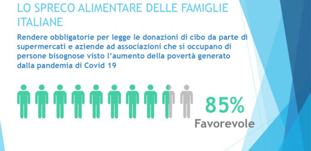L’Italia del Covid ha ridotto sensibilmente lo spreco alimentare, portandolo nel corso del 2020 a 27 kg di cibo a testa (529 grammi a settimana), l’11,78% in meno (3,6 kg) rispetto al 2019. Questo ha significato oltre 222.000 tonnellate di cibo “salvato” dallo spreco e un risparmio di 6 euro pro capite, ovvero 376 milioni euro a livello nazionale.